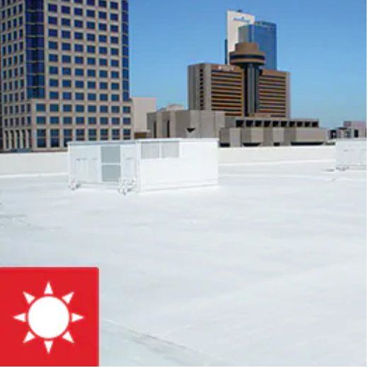 GAF offers both high solids and solvent based silicones. GAF silicones provide superior weatherproofing, ultraviolet resistance, and resistance to biological growth that helps protect against damages from ponding water. Silicone roof coatings also “chalk” less than standard acrylics increasing the time required between recoating. These products also tend to be used in high-moisture climates for their fast-drying characteristics.